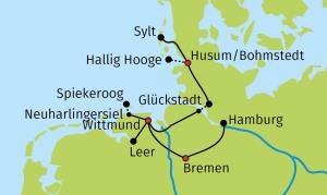 Auf 1.200 km Länge gleitet Deutschland ins Meer, mal schroff und steil, mal sandig und sanft. Diese RundReise führt uns durch Niedersachsen und Schleswig-Holstein in malerische Städte und moderne Hafenstädte, auf kleine und auf sehr berühmte Inseln, mal barfuß ins Watt, mal per Kutschfahrt über die idyllische Insel Hallig Hooge. Die Wohnräume von Theodor Storm im gleichnamigen Zentrum in Husum und das Haus Samson, eine museales Kaufmannshaus in Leer, erzählen, wie man im 19. Jahrhundert an und mit der See lebte. Freunde von bildender Kunst werden sich den Besuch der Künstlerkolonie in Worpswede nicht entgehen lassen, die bedeutende Künstlerin Paula Modersohn-Becker lebte und arbeitete hier. Ganz sicher munden Friesentee mit Kluntjes und Rahm (auf Friesland natürlich Sahne) und die obligaten Matjes mit Bratkartoffeln...