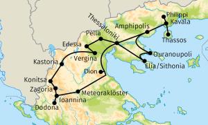 Im kulturell so ergiebigen Norden Griechenlands besichtigen wir die zwischen Himmel und Erde schwebenden Meteoraklöster, bewundern freskenreiche Kirchen, sind auf den Spuren von Alexander dem Großen in Pella unterwegs und kommen auch nach Philippi. Eine Bootsfahrt entlang des Heiligen Berges Athos schenkt uns einen imposanten Blick auf die Klöster der Mönchsrepublik.