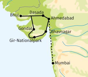 Die Halbinsel Gujarat ist Indiens westlichster Bundesstaat und Geburtsort Mahatma Gandhis. Gujarat beeindruckt nicht nur mit seinen heiligen Stätten wie dem Jain-Heiligtum Palitana oder dem 5000 Jahre alten Sonnentempel in Modhera. In Gujarat leben zahlreiche interessante Völker, deren Traditionen wir zum Teil kennen lernen wollen. Hier finden wir einzigartige Naturschutzgebiete, u.a. den Zufluchtsort der letzten Asiatischen Löwen im Gir Nationalpark oder die riesigen Salzwüsten des Rann of Kutch. Einzigartiger Reichtum des alten indischen Adels wie beim Palast von Baroda steht neben den vom Tourismus noch kaum berührten beschaulichen Dörfern.