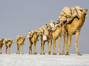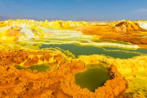 4. Tag: Salzsee Afdera - Danakil-Senke - Dallol. Heute fahren wir anfangs auf guter Asphaltstraße, danach über eine relativ schlechte Schotterpiste quer durch die Danakil-Wüste bis nach Dallol. Hier gelten die harten Bedingungen der kargen Danakil-Depression. Wir sind nahe der Grenze zu Eritrea, ca. 120 bis 166 m unter dem Meeresniveau - an einem der heißesten Orte der Erde. Am Nachmittag erster Auflug zu den „Puddings“, den Schwefelsinterterrassen von Dallol. Am Weg zu diesem besonderen Ort treffen wir wahrscheinlich auf eine Salz-Karawane der Afar mit Dromedaren und manchmal auch Eseln. Auch heute übernachten wir auf einfachen Liegebetten unter dem äthiopischen Sternenhimmel.