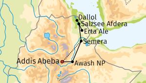 Auf Landkarten bis in die 30er Jahre des 20. Jh. findet sich eine große, weite, weiße Fläche zwischen dem Hochland von Äthiopien, Eritrea, Djibouti und dem somalischen Ogaden: Danakil. Wegen seiner Bewohner wird der Nordteil auch als das Afar-Dreieck bezeichnet. Die Afar, bis in die Mitte des letzten Jahrhunderts wegen ihrem Stolz und ihrer Unregierbarkeit als „gefährlich“ tituliert, feindlich gegenüber jedem Besucher, gelten heute auch noch als ein distanziertes Volk, „exotisch“ und sehr fremdartig. Im Afar-Dreieck stoßen drei Erdplatten aufeinander und bilden eine hochvulkanische Zone. Teilnehmer an dieser Expedition erleben nicht nur die Danakil-Depression, sondern auch die Salzseen Ass-Ale und Afdera, vor allem aber den Vulkan Erta Ale und die hydrothermalen Quellen von Dallol mit den einzigartigen, farbenprächtigen Schwefelsinterterrassen, den „Puddings“. Den schönen Abschluss unserer abenteuerlichen Reise bildet der Awash-Nationalpark, Naturparadies und eines der ältesten Naturschutzgebiete des Landes Äthiopien.