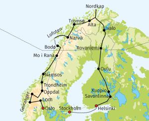 Viele Wege führen zum Nordkap, der schönste führt eindeutig durch Norwegen: von Oslo über das bezaubernde Gudbrandstal zu Stabkirchen, Fjorden und Gletschern - über den Polarkreis auf die Lofoten und weiter durch Lappland zum Nordkap. Vorbei am Inarisee und quer durch die Finnische Seenplatte erreichen wir die finnische Hauptstadt Helsinki. Am Abschluss unserer Reise steht die vielleicht schönste skandinavische Hauptstadt - Stockholm.